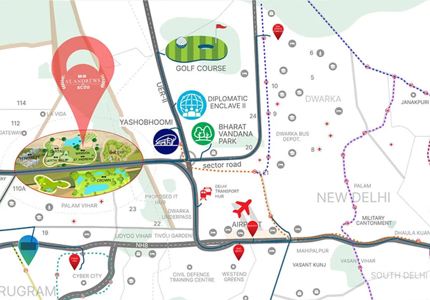 M3M St Andrews Location is on Golf Course Extension Road, Gurgaon, with seamless connectivity to Delhi NCR, IGI Airport, key commercial hubs, and upcoming metro stations, making it highly accessible for both residents and investors looking for premium urban living.